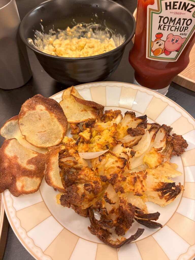 コロッケ,ポテト,油淋鶏とかも揚げたのですがオニオンブロッサムにも挑戦しました.